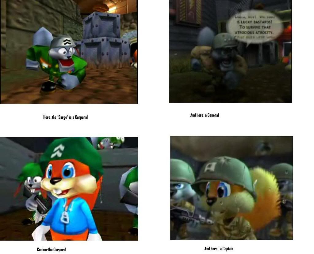 I've heard the large gray squirrel being referred to as 'The Sarge', but in Bad Fur Day, the symbol on his helmet was that of a Corporal. The same thing went for Conker. In Live and Reloaded, the symbol on the 'Sarge's helmet is a General's symbol while Conker's was that of a captain. Rodent didn't have any symbols on his helmet in either game, meaning he was a Private. Theses follow the U.S Army insignias. Take a look Side note: Drill Sergeant Jamjars's helmet has a U.K Sergeant insignia. Discuss?